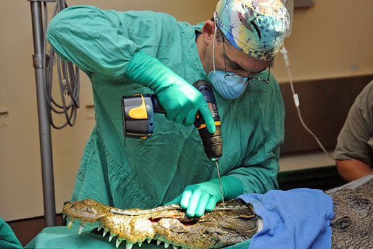 據(jù)英國(guó)媒體3月18日?qǐng)?bào)道,美國(guó)佛羅里達(dá)動(dòng)物園一只受傷的大鱷魚,經(jīng)過(guò)手術(shù),頭部被41枚釘子以及4塊鐵板固定,現(xiàn)在被人戲稱為“機(jī)器鱷魚”。這只長(zhǎng)達(dá)10英尺的鱷魚是在一起車禍?zhǔn)鹿手惺軅。?jīng)醫(yī)生介紹,現(xiàn)在鱷魚的恢復(fù)情況良好。