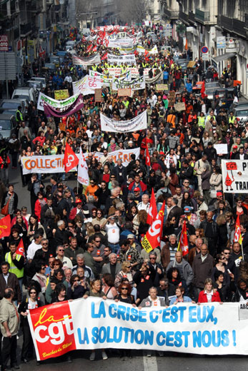 3月19日法國各大工會在全國各地聯(lián)合組織罷工和示威游行等活動,抗議政府在應(yīng)對當(dāng)前經(jīng)濟危機過程中忽視勞動者權(quán)益和社會福利。