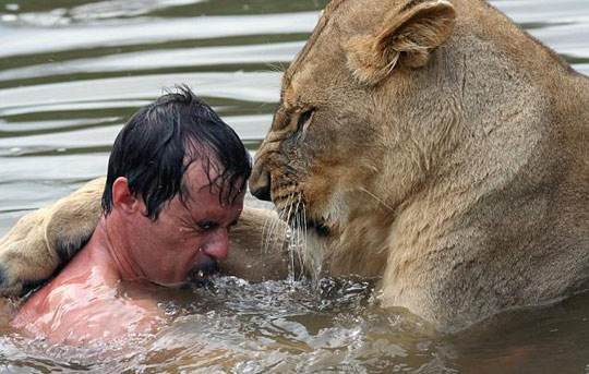南非動(dòng)物學(xué)家與獅共泳,F(xiàn)年34歲的動(dòng)物學(xué)家凱文經(jīng)常采用不同尋常的方法(一起玩、一起睡覺、一起游泳等等)來和常人畏懼的動(dòng)物進(jìn)行交流,同時(shí)和動(dòng)物們建立了很好的個(gè)人感情。和他一起游泳的獅子Meg ,體重185公斤,是個(gè)愛好游泳的獅子。