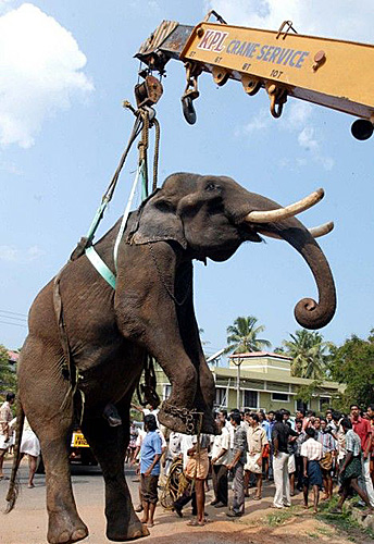 4月1日,印度喀拉拉邦一頭公象在交通繁忙的公路上被一輛卡車撞到,兩條后腿骨折和背部受傷,獸醫(yī)不得不動(dòng)用起重機(jī)來搬運(yùn)這個(gè)“龐然大物”。據(jù)報(bào)道,這頭大象高9英尺(約2.7米),重達(dá)6噸,剛剛從附近的一家印度教寺廟逃出。在事發(fā)現(xiàn)場,數(shù)百名觀眾正在觀看獸醫(yī)如何救治受傷的大象和如何將它搬離現(xiàn)場。一名獸醫(yī)表示,這頭大象體型龐大,情緒極不穩(wěn)定。不過,它此前一直生活在附近人來人往的寺廟,所以對人并不十分恐懼。在對大象做過全面評估后,他們決定從附近的建筑工地上征用一輛起重機(jī),將這頭大象吊到卡車上,將它運(yùn)往一家獸醫(yī)醫(yī)院。據(jù)悉,搬運(yùn)工作進(jìn)展得十分順利。不過,令人可悲的是,盡管獸醫(yī)在努力救治這頭大象,但由于它的傷勢過于嚴(yán)重,于當(dāng)天晚間死去。