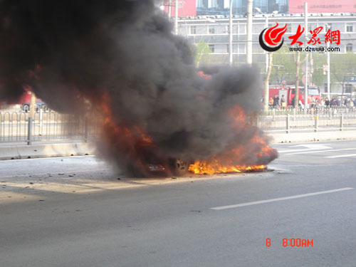 8日早7:50,濟南市歷山路與和平路路口,一輛轎車在行駛途中突然爆燃,熊熊大火和濃煙頓時彌漫方圓數(shù)十米,迅速而來的消防人員2分鐘撲滅大火,自燃轎車已經面目全非,只?蚣埽也o人員傷亡。記者用手機拍下了整場火災的全過程。