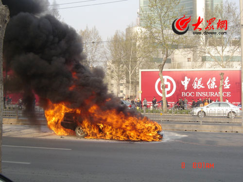 7:45,記者行至歷山路大潤發(fā)北側,突然聞到前方傳來一股濃烈的焦糊味,立即向前奔去,跑至歷山路與和平路路口南側30米處,看到一輛車號為魯A77XX8的轎車著起了熊熊大火,發(fā)出噼噼啪啪的聲音,濃濃的黑煙騰空而起足有十幾米高,俄頃就彌漫方圓數(shù)十米。周圍的車輛在交警的指揮下紛紛繞行外道,躲避大火。大約4分鐘后,消防車從北面呼嘯而至,消防人員動用兩支水槍、左右夾擊,大約2分鐘后就將大火撲滅。此時,自燃轎車已經燒得面目全非,只剩下黑乎乎的框架。記者上前查看,看到轎車里面還放著成堆的紙制品。
