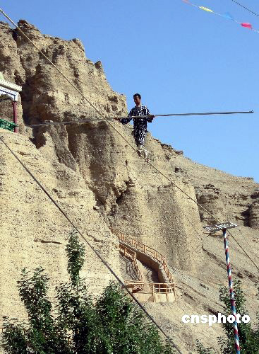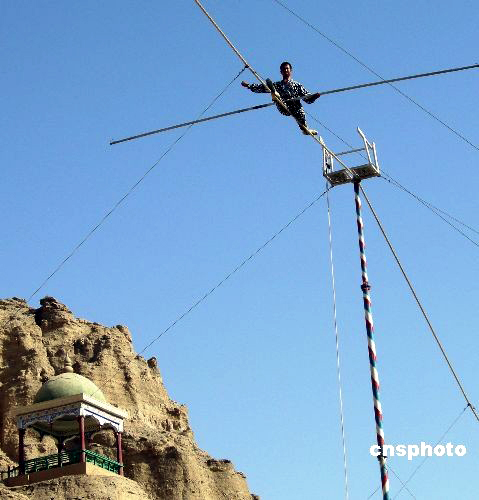 6月2日,新疆吐魯番著名的國家5A級風(fēng)景區(qū)葡萄溝上演了一場“達(dá)瓦孜”表演。演員在距離地面30多米的高空一根3厘米左右的鋼絲上時而健步如飛,時而倒掛,時而做各種高難度體操動作,令觀看的游客無不稱奇。達(dá)瓦孜是維吾爾族傳統(tǒng)民間雜技表演藝術(shù)之一,“達(dá)瓦孜”是新疆維吾爾語“高空走繩”的意思。中新社發(fā) 姜浩 攝