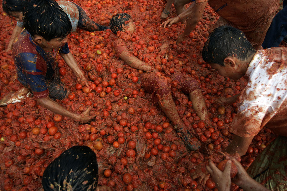 2009年6月14日,哥倫比亞第五屆番茄狂歡節(jié)開幕,參與者互相投擲西紅柿,盡情狂歡慶豐收。來自哥倫比亞各地的狂歡者們云集在首都波哥大東北部的蘇塔馬錢小鎮(zhèn),街道上立刻變成了西紅柿紛飛的戰(zhàn)場。雖然每個人的臉上身上沾滿了西紅柿汁,但人們還是樂此不疲又是丟又是砸,把成堆的西紅柿當(dāng)成打仗的“武器”。還有人特地穿上白衣白褲,身上越紅,心里就越痛快。