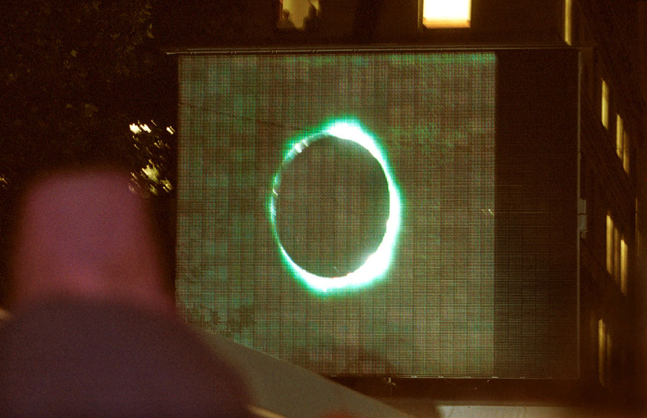 1999年8月11日,在德國斯圖加特,人們在屏幕上看到日全食的天象。