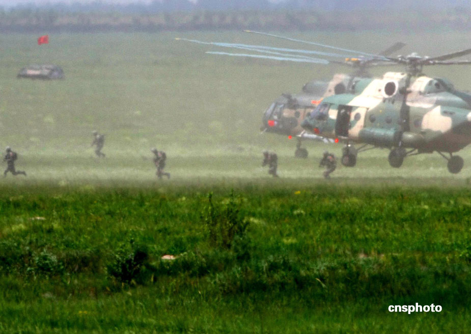 中國、俄羅斯兩軍總參謀長,7月23日上午到沈陽軍區(qū)洮南合同戰(zhàn)術(shù)訓(xùn)練基地,觀看“和平使命2009”聯(lián)合反恐軍事演習(xí)。雙方以陸軍和空軍為主,中方參演部隊包括1個陸軍戰(zhàn)斗群和1個空軍戰(zhàn)斗群。俄方參演兵力包括1個陸軍加強摩步營、1個空降突擊連和部分空軍兵力,雙方投入兵力兩千多人。中新社發(fā) 宋吉河 攝