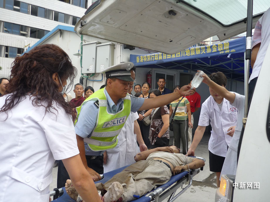 25日凌晨四點(diǎn)鐘左右,汶川縣境內(nèi)國(guó)道二一三線徹底關(guān)大橋被山上飛下來的巨石砸斷,已造成100米的橋面坍塌,7輛汽車受損,12人不同程度受傷,3人死亡,都汶路通行中斷。圖為汶川縣人民醫(yī)院正在積極搶救傷員。 汶新 攝