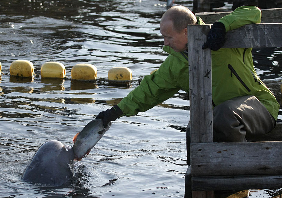 俄羅斯總理普京7月31日在太平洋的契卡洛夫島為一條白鯨裝上衛(wèi)星追蹤器。其后他更幫手喂其他白鯨魚吃。