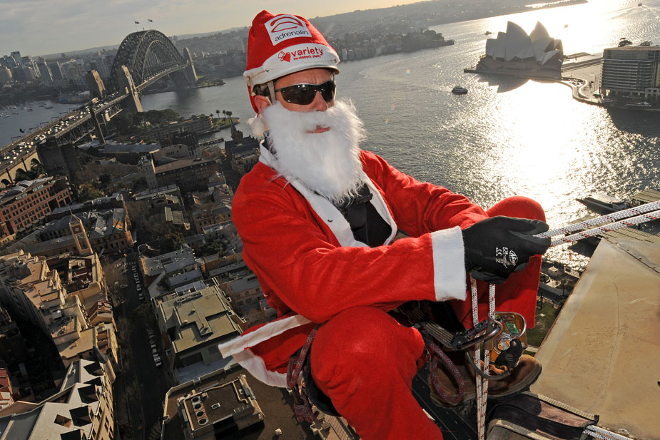 8月5日,澳大利亞5名男子身著圣誕老人服飾從悉尼歌劇院旁一高層酒店樓頂“從天而降”。