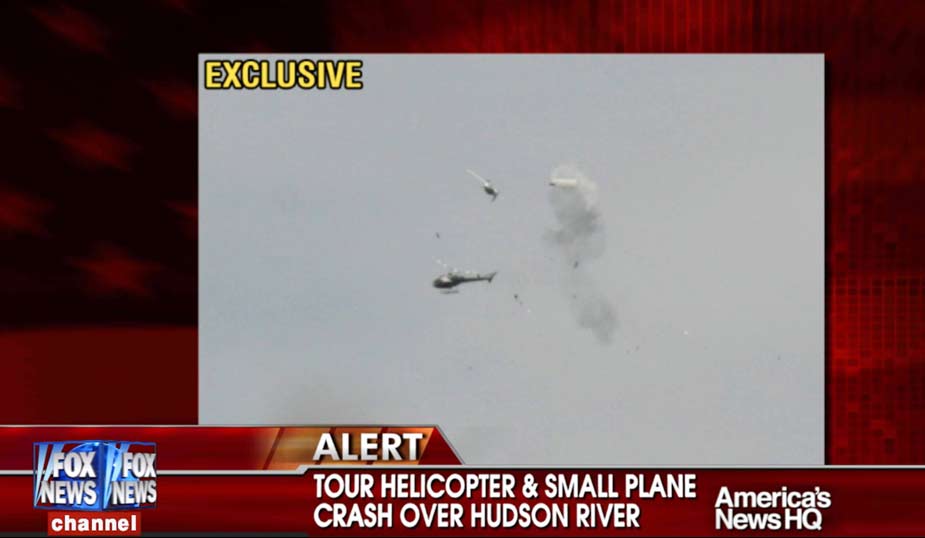 8月8日,紐約市曼哈頓西側(cè)的哈德遜河上空,一架觀光直升飛機和一架小型飛機相撞,兩飛機雙雙墜入河中。據(jù)稱觀光直升飛機上載有五名意大利游客和一名飛行員,而小型飛機上則有三人。圖為電視臺播放的兩飛機相撞的視頻截圖。