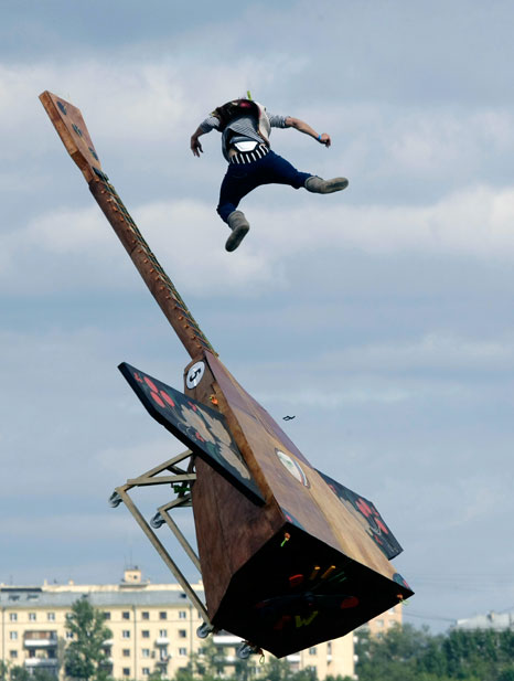 8月9日,莫斯科河畔舉辦一年一度的“墜落節(jié)”,表演者帶著自己設(shè)計(jì)制作的各種“飛行器”勇敢的從高空跳入水中。