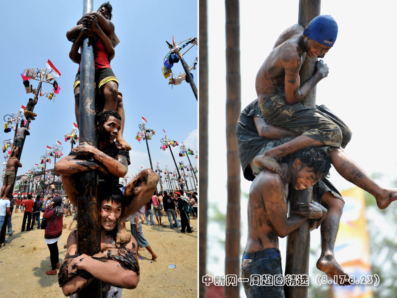 8月17日,近2000名年輕人在印尼首都雅加達(dá)一個公園內(nèi)參加爬桿大賽,慶祝國家獨立64周年。點擊觀看詳細(xì)內(nèi)容