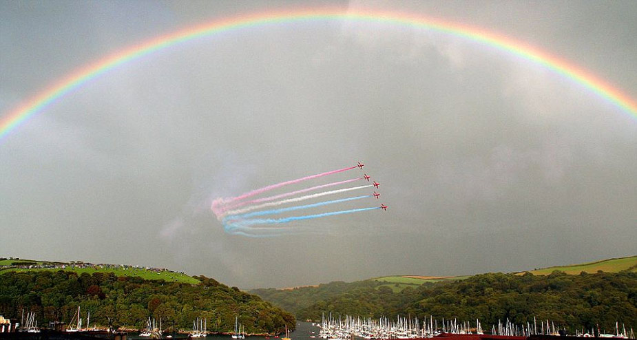 據(jù)英國媒體近日報道,英國皇家空軍“紅箭”飛行表演隊(duì)20日在英國康沃爾郡福伊港進(jìn)行飛行特技表演時,恰巧天邊出現(xiàn)一道彩虹,相映成輝,異常漂亮。