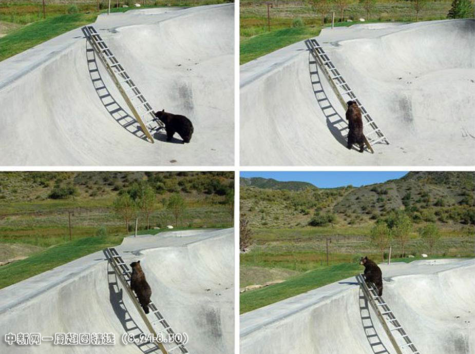 8月25日,美國科羅拉多州一只被困滑板池的狗熊成功爬梯逃生,在監(jiān)控器前上演了一出“狗熊版越獄”。圖片來源:中國新聞網(wǎng)