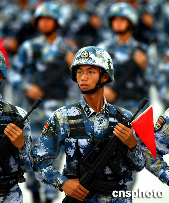 9月3日,解放軍官兵在位于北京郊區(qū)的一處徒步方隊閱兵村內(nèi)訓練。今年國慶節(jié)將舉行新中國成立60周年國慶首都盛大閱兵儀式。中新社發(fā) 宋吉河 攝