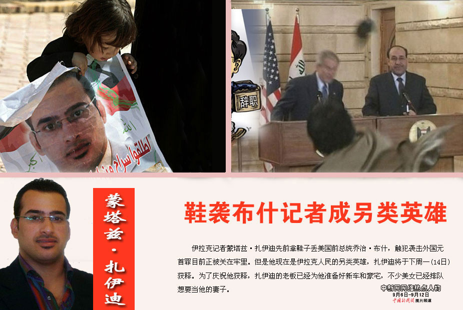 中新網(wǎng)本周熱點(diǎn)人物之——蒙塔茲·扎伊迪 伊拉克記者蒙塔茲·扎伊迪先前拿鞋子丟美國(guó)前總統(tǒng)喬治·布什,觸犯襲擊外國(guó)元首罪目前正被關(guān)在牢里。但是他現(xiàn)在是伊拉克人民的另類英雄,扎伊迪將于下周一(14日)獲釋。為了慶祝他獲釋,扎伊迪的老板已經(jīng)為他準(zhǔn)備好新車和豪宅,不少美女已經(jīng)排隊(duì)想要當(dāng)他的妻子。