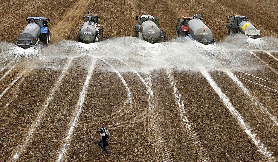9月16日,比利時(shí)奶農(nóng)向地里傾倒了3百萬升鮮牛奶做“農(nóng)肥”,抗議奶價(jià)暴跌。奶農(nóng)們認(rèn)為,提高牛奶生產(chǎn)配額造成歐盟市場上奶制品供大于求,進(jìn)而引發(fā)價(jià)格暴跌。圖片來源:中國新聞網(wǎng)