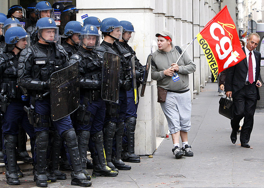 9月17日,在巴黎的金融市場管理局總部前,一名固特異公司雇員與保衛(wèi)總部大樓的防暴警察面對面。當(dāng)天,數(shù)百人舉行抗議反對汽車制造業(yè)裁員和重組。圖片來源:中國新聞網(wǎng)