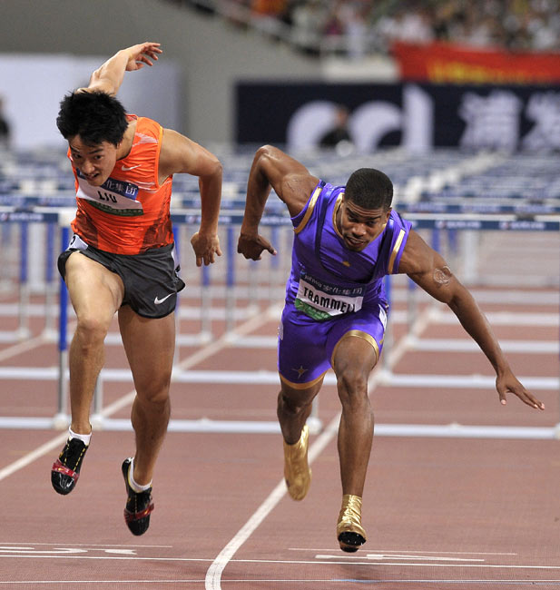 圖為賽場(chǎng)上的翔飛人。在20日晚進(jìn)行的上海田徑大獎(jiǎng)賽的男子110米欄的比賽中,劉翔時(shí)隔13個(gè)月后重返賽場(chǎng),并跑出13秒15的成績(jī)。美國(guó)名將特拉梅爾以13秒15的同樣成績(jī)、近乎為零的優(yōu)勢(shì)奪走冠軍。