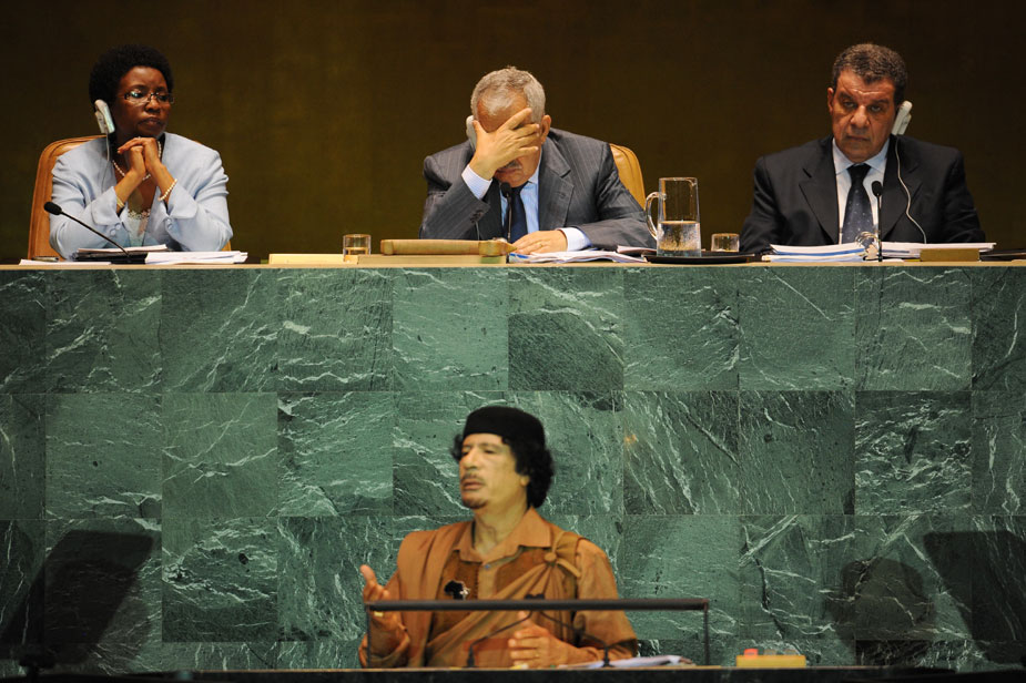 執(zhí)政40年來首次在聯合國亮相的利比亞領導人卡扎菲,23日在聯大一般性辯論上發(fā)表演講,強力攻擊安理會和聯合國的現有體制,并將原定15分鐘的演講拖到一個半小時,很多國家代表團成員最后堅持不住,紛紛離開會議現場。圖片來源:中國新聞網