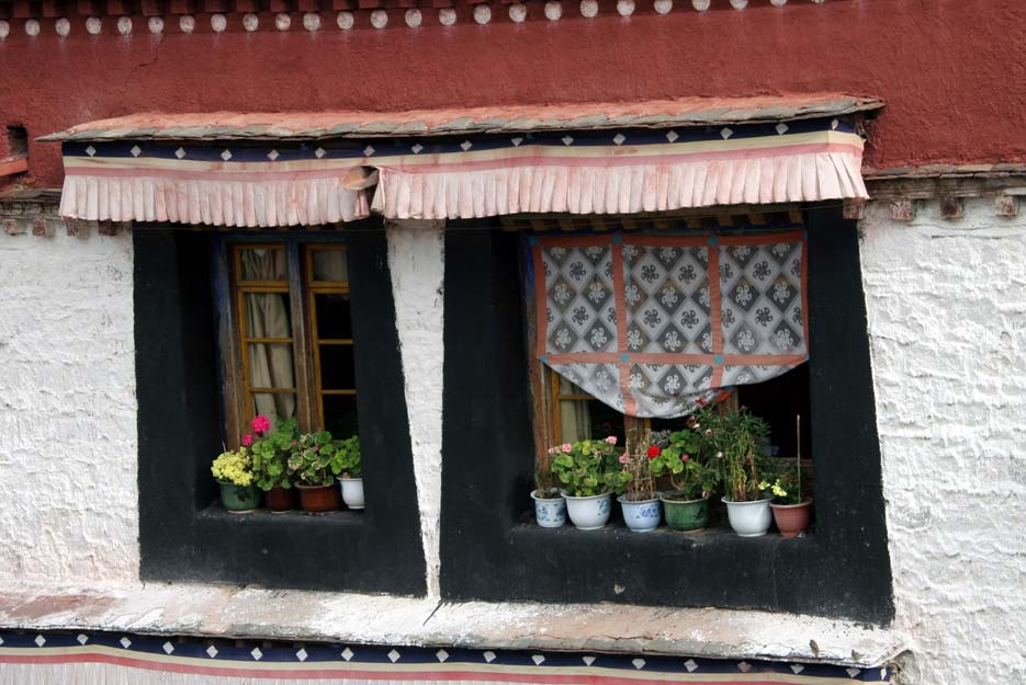大昭寺里僧舍的窗臺(tái)上擺滿了鮮花。