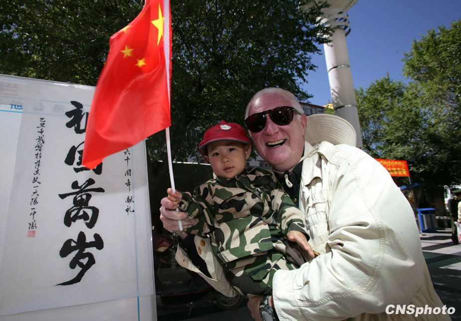 9月27日上午,為迎接國慶60周年,武警西藏總隊(duì)官兵為駐地群眾開展擁政愛民、服務(wù)群眾便民活動(dòng)。一位外國游客抱著中國孩子,在武警官兵的書法作品“祖國萬歲”前,一起搖動(dòng)五星紅旗,共慶新中國國慶60周年。 中新社發(fā) 錢檬 攝