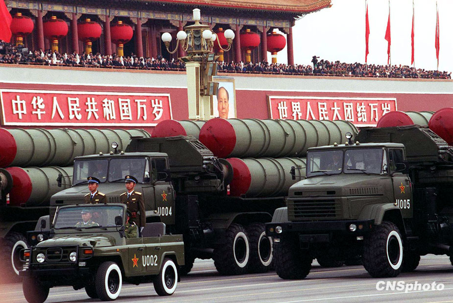 圖為空軍的中遠(yuǎn)程地對空導(dǎo)彈出現(xiàn)在1999年國慶閱兵行列中。中新社發(fā) 滿會喬 攝