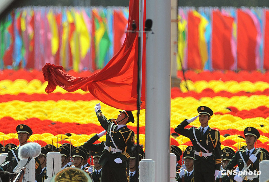 2009年10月1日,中華人民共和國成立60周年慶祝大會(huì)在北京天安門廣場舉行。圖為升旗儀式。中新社發(fā) 廖攀 攝