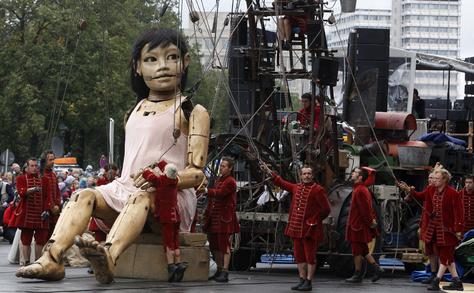 10月2日,來(lái)自法國(guó)一家戲劇公司的兩個(gè)巨型提線(xiàn)木偶亮相柏林街頭,它們將在露天劇場(chǎng)進(jìn)行表演,以此紀(jì)念柏林墻推倒20周年。