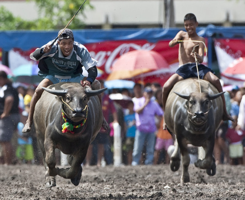 10月3日,泰國(guó)一年一度的騎水牛大賽在春武里舉行。