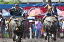 10月3日,泰國一年一度的騎水牛大賽在春武里舉行。