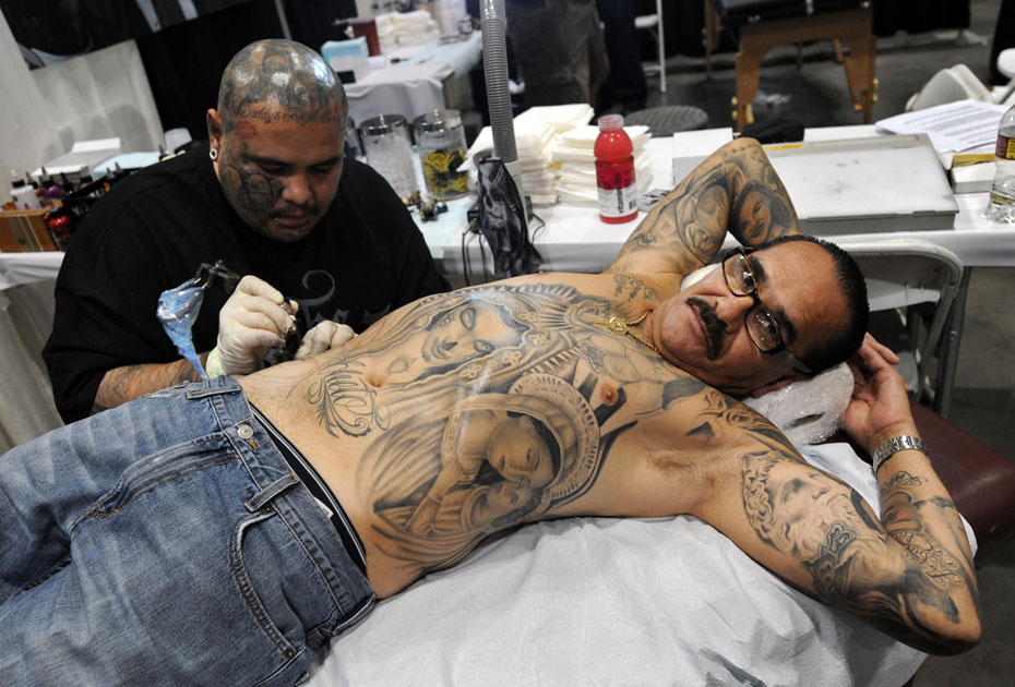 圖為觀眾在人體紋身藝術(shù)博覽會(huì)上紋身。