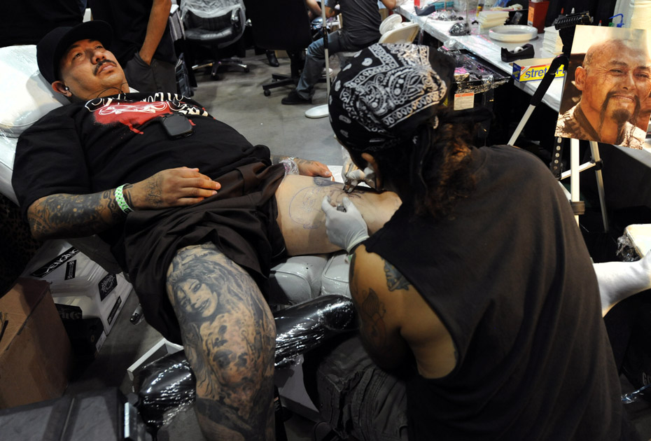 圖為觀眾在人體紋身藝術(shù)博覽會(huì)上紋身。