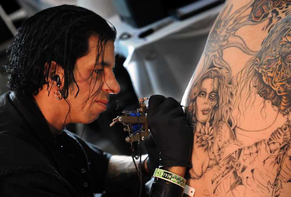 圖為觀眾在人體紋身藝術(shù)博覽會上紋身。