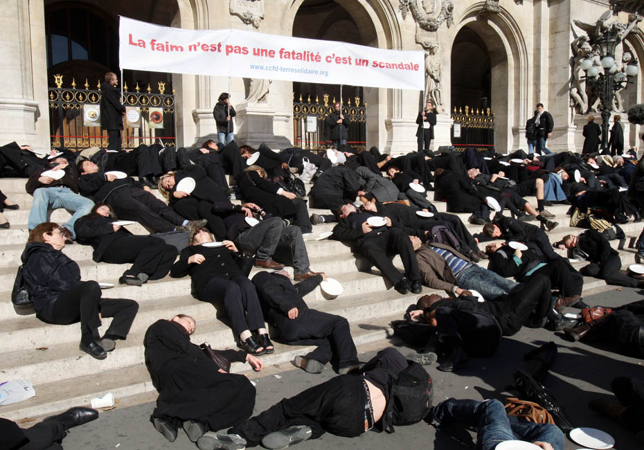 10月15日,示威者身穿黑色衣服、手持空盤子在巴黎歌劇院前抗議。他們此舉是為了呼吁人們關(guān)注世界上的饑民。圖片來源:中國(guó)新聞網(wǎng)