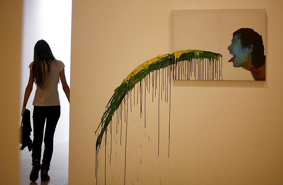 周日(10月11日),塞爾維亞貝爾格萊德舉行的十月藝術(shù)沙龍展上,一名參觀者走過一幅藝術(shù)作品。圖片來源:中國新聞網(wǎng)
