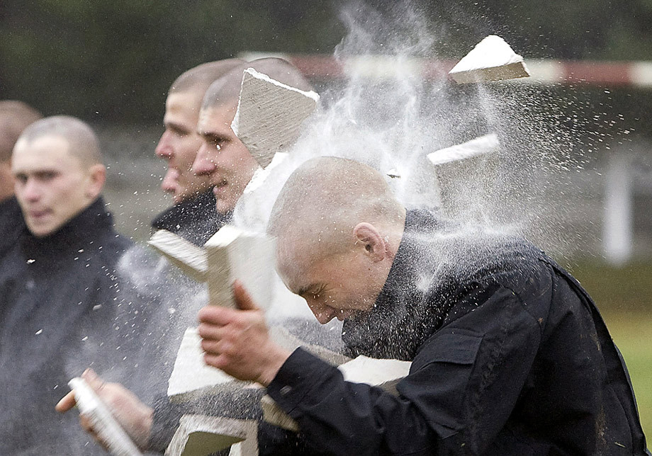 周三(10月14日),白俄羅斯一名士兵在軍營(yíng)里展示他的“鐵頭功”。圖片來源:中國(guó)新聞網(wǎng)