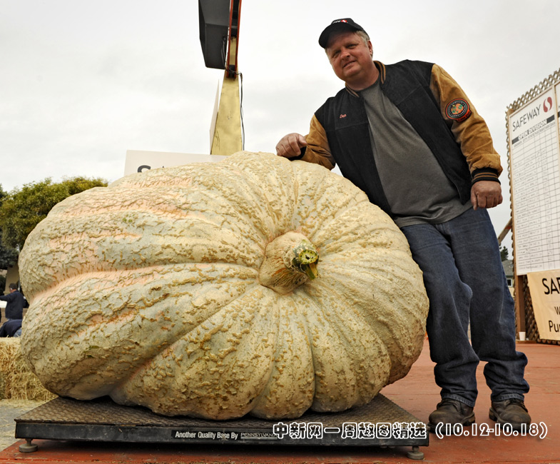 10月12日,美國加利福尼亞州農(nóng)場主Don Young種植的南瓜以1658磅(約752.06公斤)打破世界紀錄。圖片來源:中國新聞網(wǎng)
