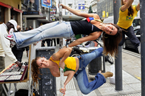 圖為街頭表演的舞者將路邊電線桿與路燈當(dāng)做“鋼管”。