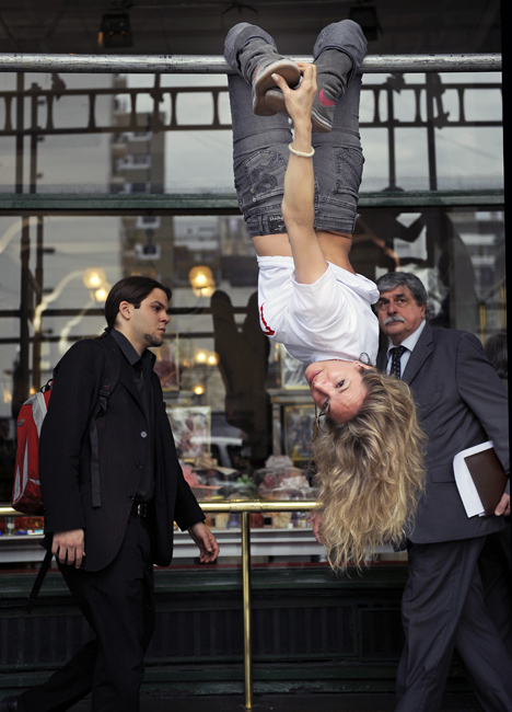 10月19日,阿根廷布宜諾斯艾利斯市街頭,鋼管舞小姐在街頭表演,路邊的路燈、電線桿變身為鋼管舞道具。圖片來(lái)源:中國(guó)新聞網(wǎng)