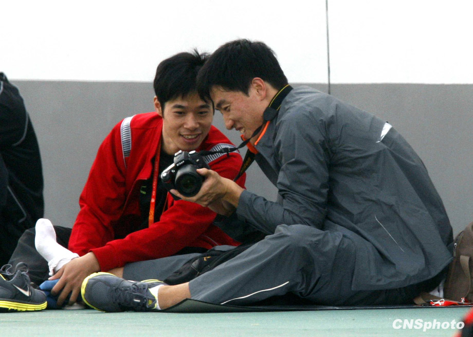 10月22日下午,“飛人”劉翔亮相濟南奧體中心田徑訓練場,在教練孫海平的帶領下,輕松備戰(zhàn)全運會。來源:中國新聞網