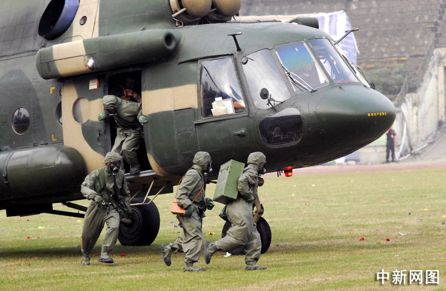 首先趕到現(xiàn)場的是一架米—171直升機(jī),4名防化偵察員全身防護(hù)狀態(tài)下依次著陸。著陸后,其中2人實(shí)施先期偵察,簡單了解情況后對商場外空氣、進(jìn)出道路及商場外部設(shè)施進(jìn)行偵察,初步查明遭襲情況,并采集收取樣品;另外2人指導(dǎo)公眾防護(hù)并協(xié)助組織撤離危害區(qū)。 郝飛 攝