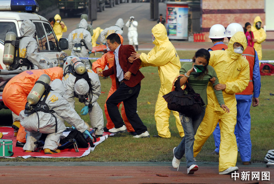 緊隨其后進(jìn)場(chǎng)的是防化醫(yī)學(xué)救援隊(duì)。該分隊(duì)指揮員帶領(lǐng)后續(xù)偵察分隊(duì)、洗消分隊(duì)和化驗(yàn)組,分別乘坐4輛防化偵察車(chē)、1輛淋浴車(chē)和1輛防化化驗(yàn)車(chē)入場(chǎng)。穿藍(lán)色和橙色防護(hù)服的防化醫(yī)學(xué)救援隊(duì)入場(chǎng)后,醫(yī)療衛(wèi)生人員迅速展開(kāi)裝備,組織檢驗(yàn)監(jiān)測(cè),開(kāi)設(shè)臨時(shí)醫(yī)療所,區(qū)分觀察區(qū)、檢診區(qū)、洗消區(qū)和處置區(qū),救護(hù)車(chē)開(kāi)始中毒人員轉(zhuǎn)運(yùn)。 郝飛 攝
