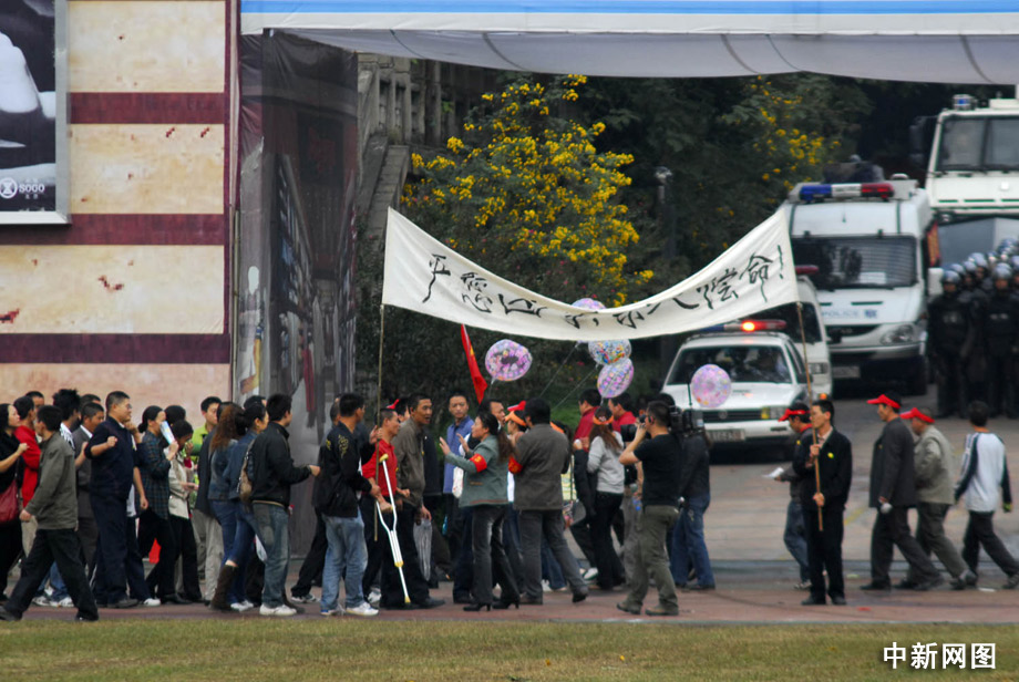在演練現(xiàn)場,重慶發(fā)生“生化襲擊事件”,偵破工作正在進行時,受害人家屬以賠償和嚴(yán)懲兇手為由進行非法游行,堵塞交通和大型商場通道,擾亂交通秩序和正常經(jīng)營,引來大量群眾圍觀。 郝飛 攝