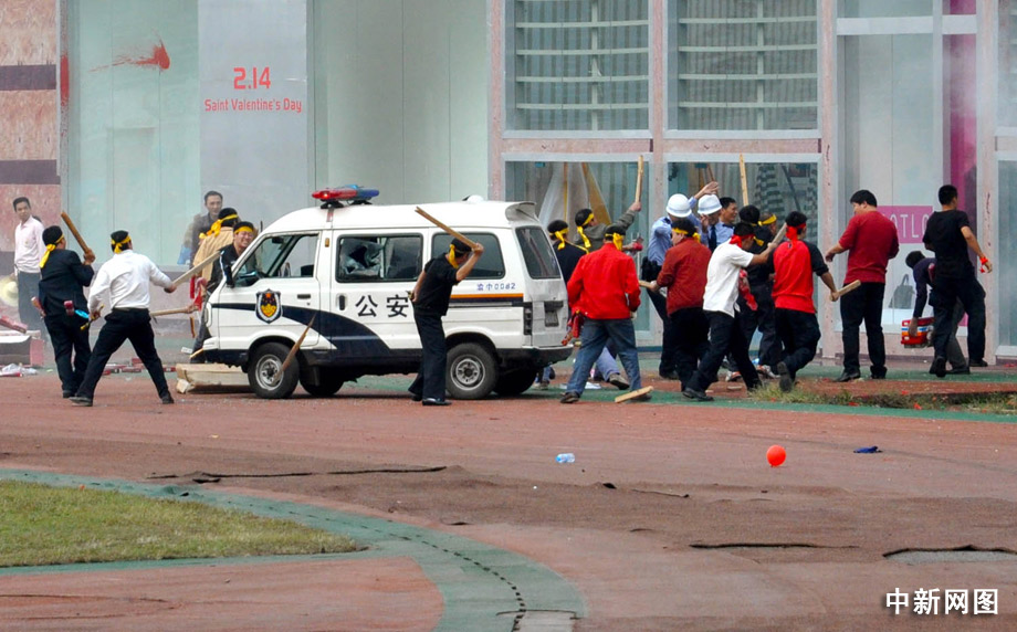 陸續(xù)涌來的“暴徒”,帶來了鐵棍、長刀、鐵鏈等兇器,并結(jié)伙圍打執(zhí)勤民警,出現(xiàn)摔、砸商業(yè)設(shè)施和投擲礦泉水瓶等行為,在廣場上出現(xiàn)了反動標(biāo)語,“暴徒”不斷叫囂反動語言,引發(fā)附近眾多群眾圍觀,鬧事人群已達(dá)200余人。曹多然 攝
