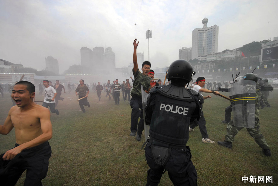23日,推進(jìn)“平安重慶”建設(shè)突發(fā)事件應(yīng)急演練在該市渝中區(qū)大田灣體育場舉行,重慶各警種突精銳力量重裝登場,將各類事件一一化解。