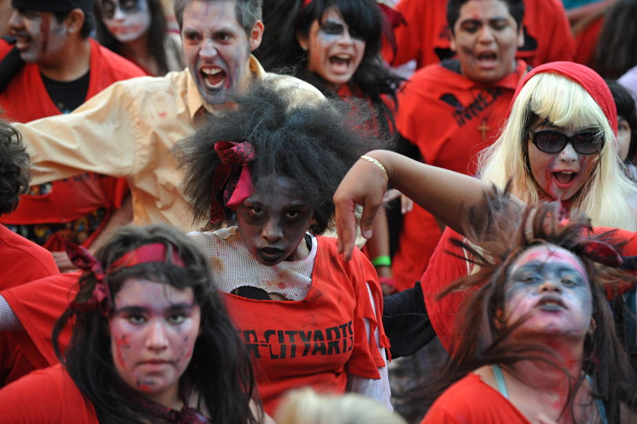 25日,“戰(zhàn)栗全世界”活動(dòng)在全球300多座城市同期舉行,全球一共有大約20000人同時(shí)跳起了邁克·杰克遜著名的戰(zhàn)栗舞。圖片來(lái)源:中國(guó)新聞網(wǎng)