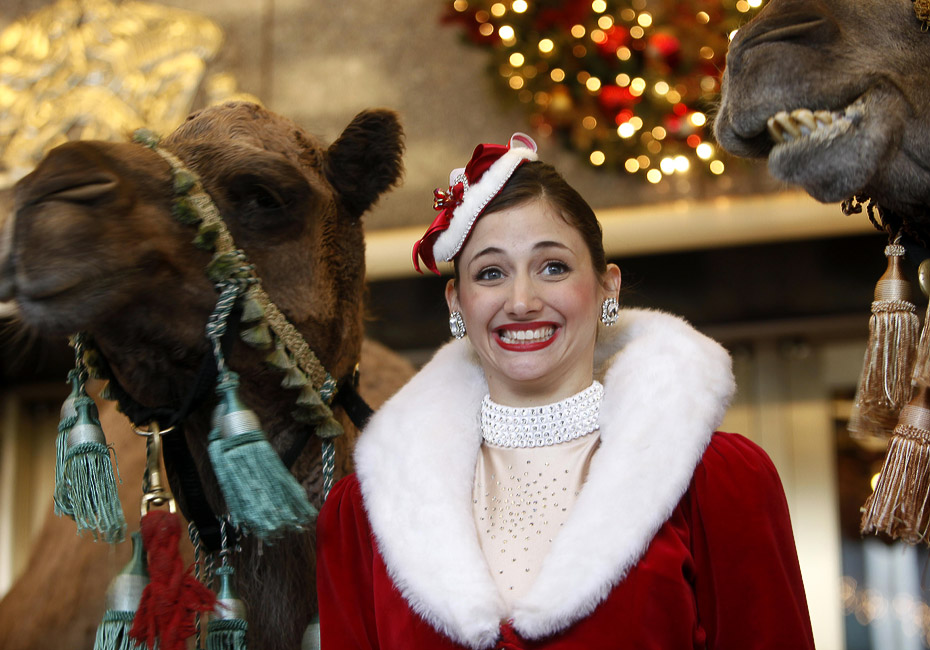 10月29日,火箭女郎舞蹈團(tuán)的姑娘們?cè)诿绹?guó)紐約廣播城音樂廳與眾多動(dòng)物明星合影,準(zhǔn)備在圣誕秀上亮相。圖片來源:中國(guó)新聞網(wǎng)
