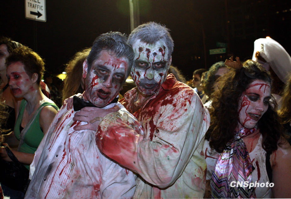 10月31日是西方的“萬(wàn)圣節(jié)”,世界各地的群眾穿著奇異的服飾、打扮鬼魅的造型迎接“鬼節(jié)”的到來(lái)。圖為紐約民眾雨中狂歡游行。中新社發(fā) 孫宇挺 攝