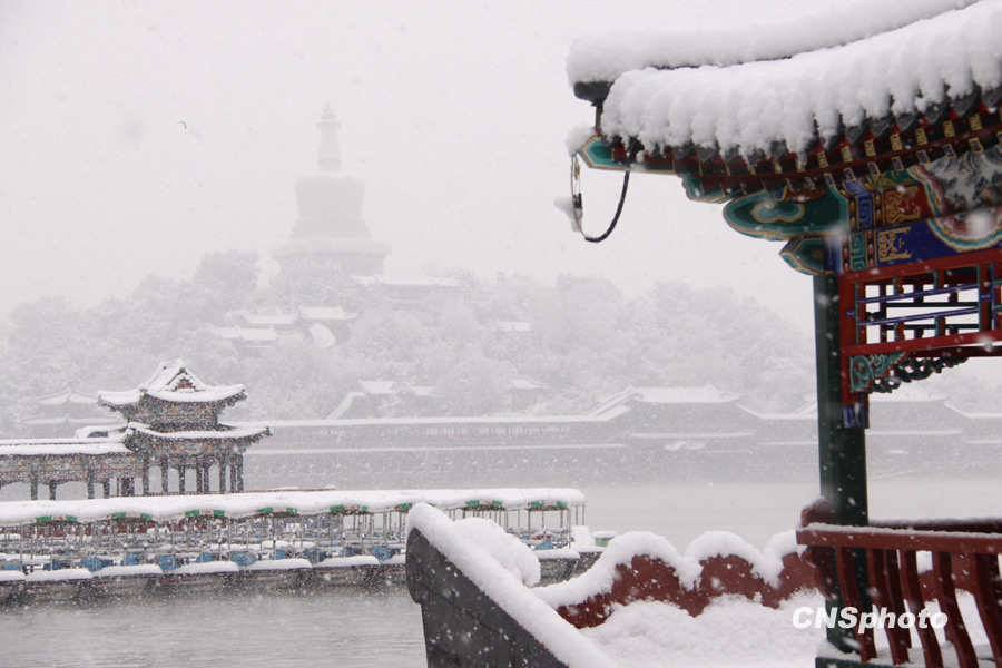 受冷空氣影響,十一月一日北京降下今冬首場(chǎng)瑞雪。北海公園大雪紛飛,銀裝素裹。中新社 發(fā) 史利 攝